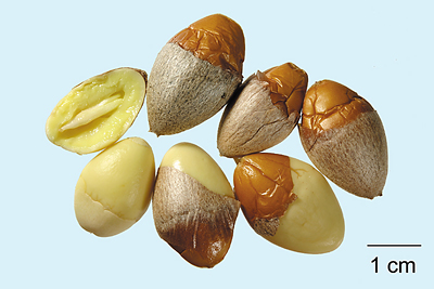 Harvest seeds in late autumn after they ripen; remove fleshy exotesta; wash clean; dry under the sun; break shells to get kernels.